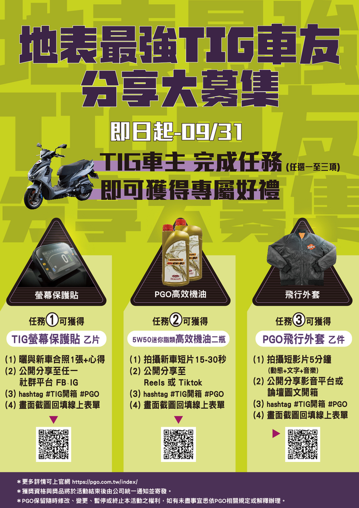 PGO 車主注意!9/31 之前參加 TIG 車友分享大募集活動三項指定任務即可獲得專屬好禮
